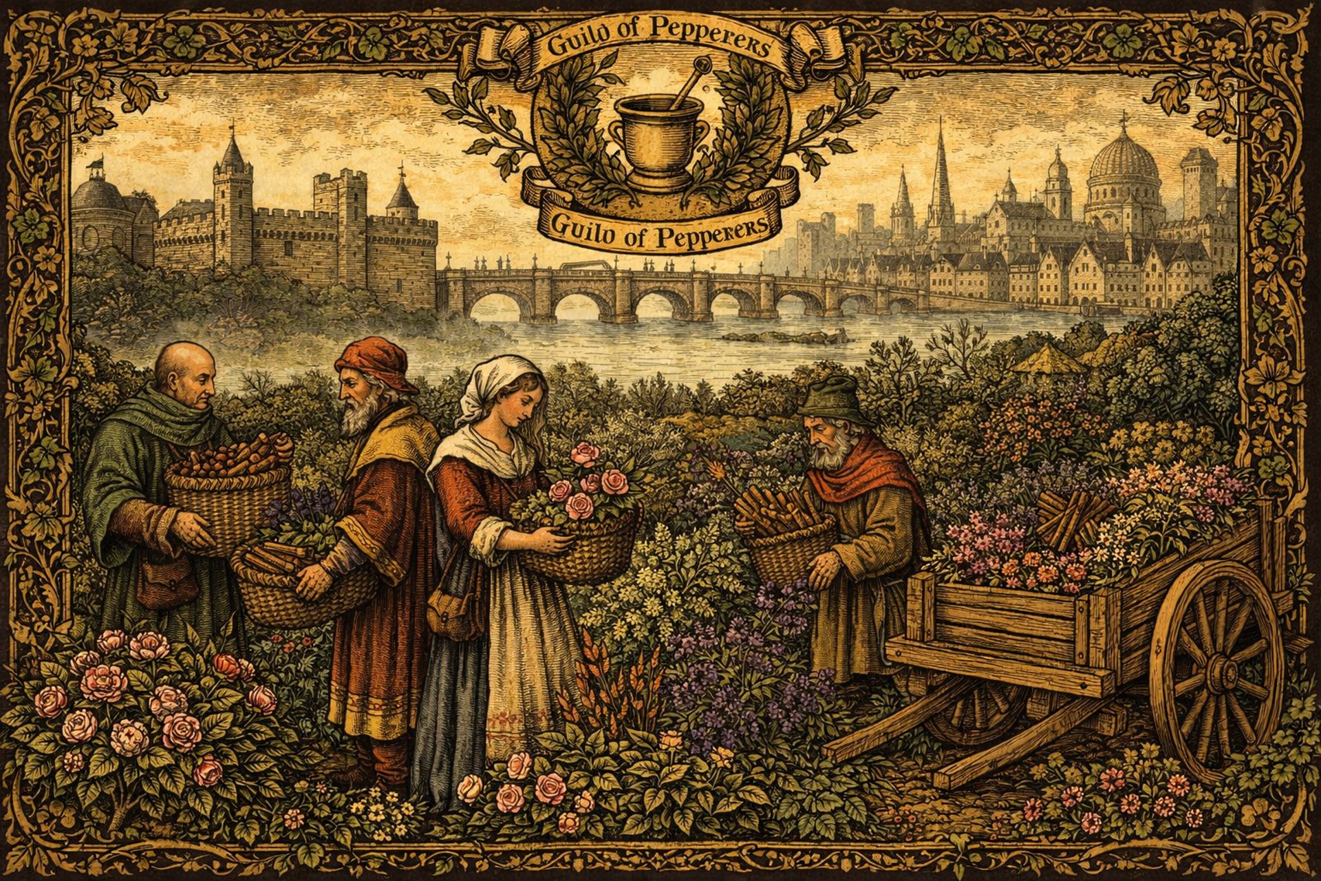 In the shadow of Old London Bridge, the Guild of Pepperers guarded more than spice — they were keepers of "portable wealth." While markets roared with the price of black peppercorns, the Guild's inner sanctum remained silent, devoted to a sacred craft.