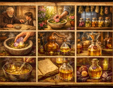 Through morning mist they gathered rare flowers and pungent spices, returning to stone halls where time seemed to slow. Every petal was carefully dried, then surrendered to deep vats of oil — macerated for weeks to draw out the very soul of each plant.