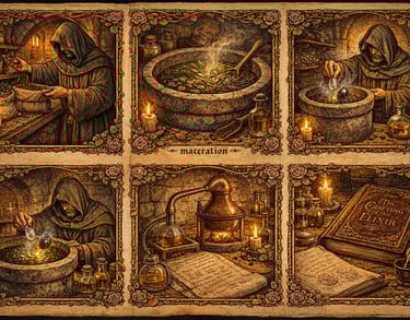 Our production follows the same five sacred steps practiced by the original Guild: gathering, maceration, crystal charging, distillation, and the golden consecration. The tools have evolved, but the philosophy remains unchanged — patience over speed, intention over automation, and the finest raw elements the earth provides.