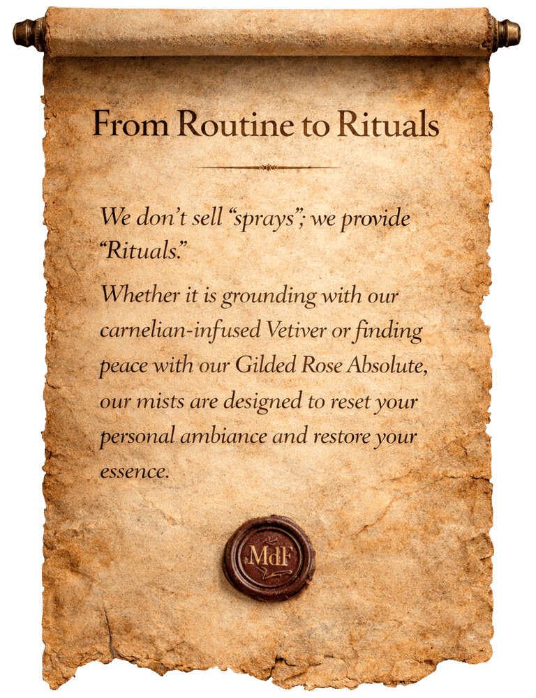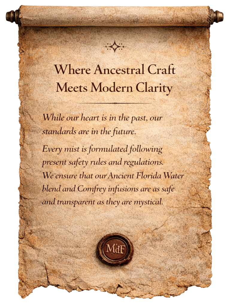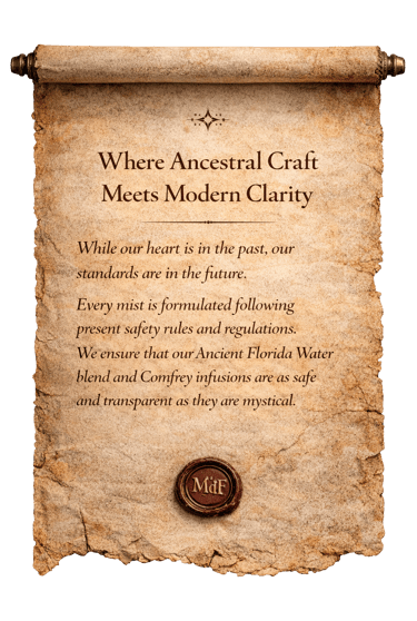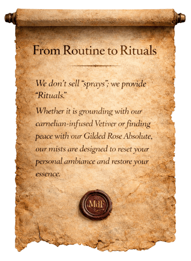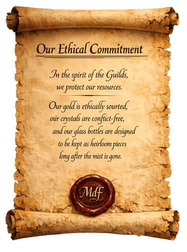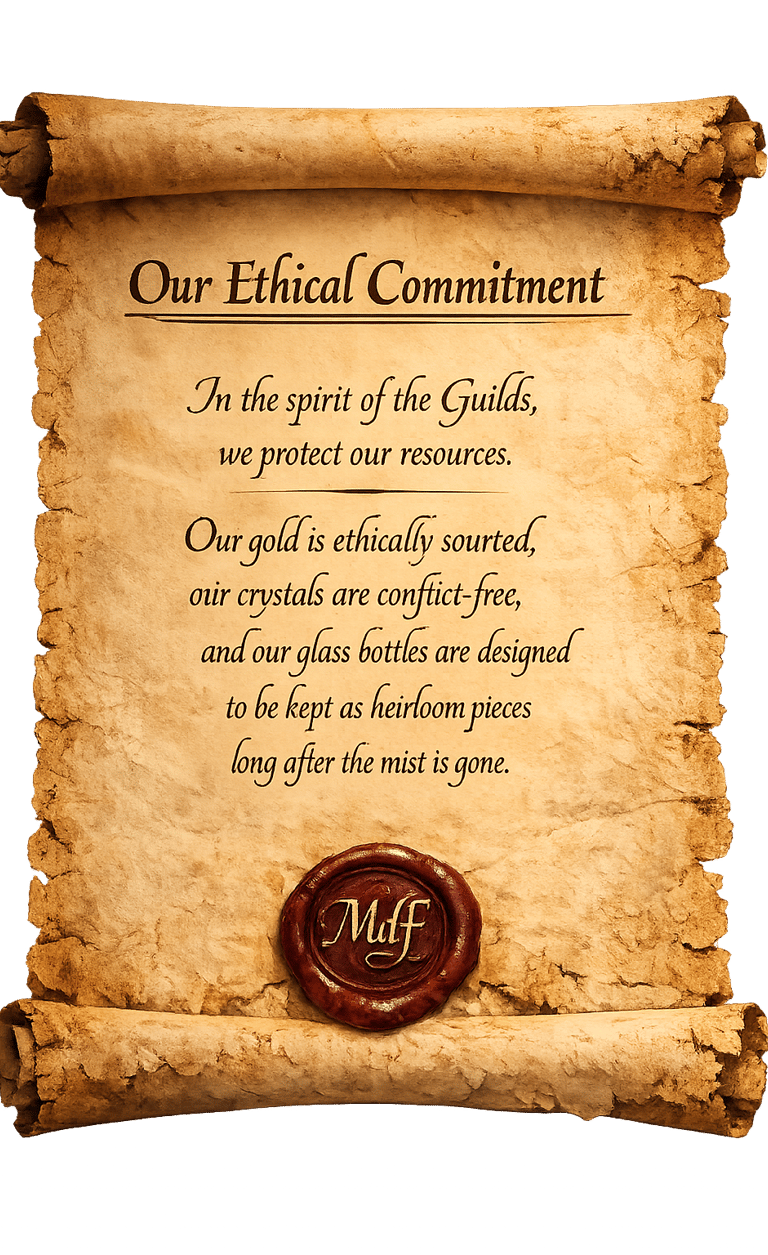 In the spirit of the Guilds, we protect our resources. Our gold is ethically sourced, our crystals are conflict-free, and our glass bottles are designed to be kept as heirloom pieces long after the mist is gone. Every formulation follows present-day safety rules and regulations - because while our heart is in the past, our standards are in the future.