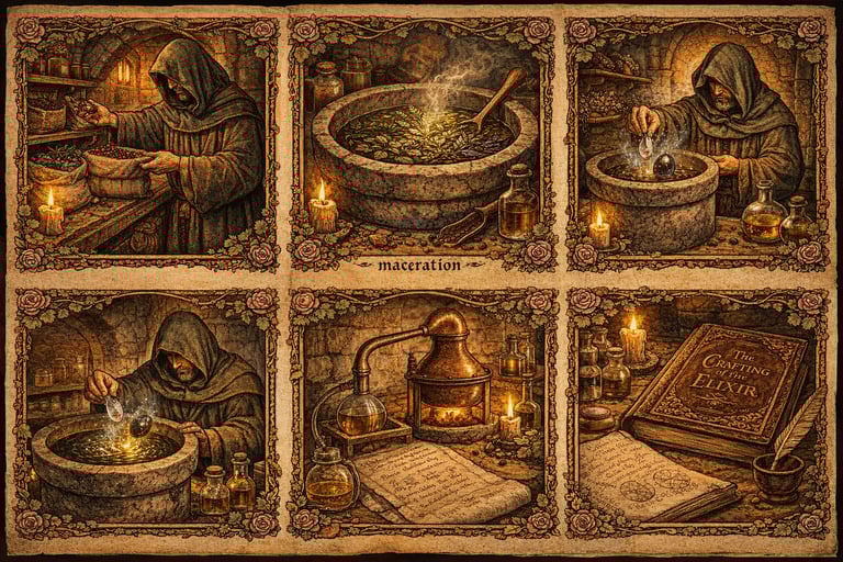 We do not merely create — we consecrate. In our hallowed ateliers, the "portable wealth" of the earth is gathered: rare flowers and sun-drenched spices, carefully dried and surrendered to the slow, silent maceration of time. For forty days and forty nights, these botanicals dream in sacred oils, their spirits drawn out by the steady pulse of the seasons.